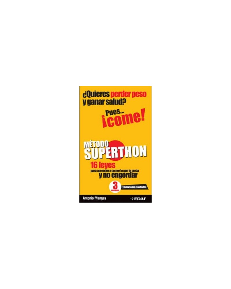 Una nueva manera de comer que eliminará tus kilos de más para siempre y te ayudará a gozar de una buena salud. Las dietas no funcionan. Por eso, lo que este libro propone no es una dieta estricta, sino unos principios de actuación, una cultura alimenticia, unos hábitos nutricionales nuevos. Con este sencillo programa, compuesto por 16 leyes, aprenderás a comer correctamente para cuidar y mejorar tu cuerpo y tu salud por ti mismo, de una manera natural y a cualquier edad. Superthon es un método práctico y muy fácil de seguir, diseñado para gente normal con vidas reales: horarios que cumplir, trabajos, niños, viajes y comidas fuera de casa. Sean cuales sean tus circunstancias, ten por seguro que podrás aplicar lo que aquí se cuenta y conseguir tus objetivos: adelgazar de forma duradera, tener más energía y mejorar tu salud. Juan (Madrid), 61 años. Perdió 7 kg en un mes. "Empecé este programa porque me sentía muy cansado y sin energía. Para mí adelgazar era secundario. Al cabo de un mes había perdido 7 kilos y tenía más energía que nunca. Además, mejoré de mi diabetes tipo 2 y reduje la necesidad de medicarme." Carmen (Sevilla), 34 años y dos hijos. Perdió 6 kg y 5 cm de cintura en un mes. "No tengo sensación ninguna de estar haciendo régimen porque no estoy haciendo régimen. No paso hambre en ningún momento. Tengo unos hábitos nuevos, y la comida la elijo yo. Nadie me dice qué debo comer. Como según mis apetencias." Arturo (Madrid), 35 años. Redujo su grasa corporal de un 21 a un 15% en tres meses. "Quería perder grasa y estaba harto de seguir dietas que no me funcionaban y que me dejaban sin energía para entrenar y hacer deporte. Con este método he encontrado lo que buscaba. Por fin veo mis abdominales y tengo más energía que nunca."