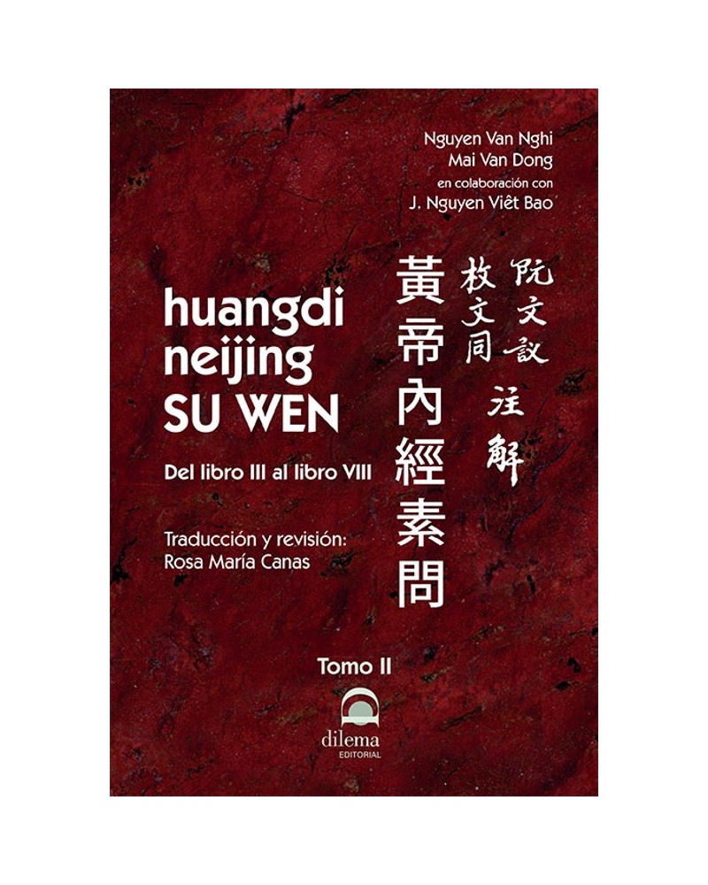 El Tomo II del huangdi neijing Su Wen. Incluye los libros III, IV, V y VIII. Traducido y revisado por Rosa María Canas. El libro III comporta cuatro capítulos, que tratan sucesivamente: 1. "EL TEMPLO DE LOS LIBROS SAGRADOS” (Linh Lan Bi Diên Luân). 2. "LAS SEIS DIVISIONES DEL AÑO Y LOS FENÓMENOS ORGÁNICOS” (Luc Tiêt Tang Tuong Luân). 3. "PRODUCCIÓN Y FORMACIÓN DE LOS CINCO ÓRGANOS” (Ngu Tang Sinh Thanh). 4. "ESTUDIO PARTICULAR DE LOS CINCO ÓRGANOS” (Ngu Tang Biêt Luân). El libro IV comporta cinco capítulos, que tratan sucesivamente: 1. "DISTINTOS MÉTODOS, DISTINTAS REGIONES” (Di Phap Phuong Nghi Luân). 2. "MOVILIZACIÓN DEL TINH Y TRANSFORMACIONES DE LA ENERGÍA” (Di Tinh Biên Khi Luân). 3. "ALCOHOLATOS Y ALCOHOLES MEDICAMENTOSOS” (Thang Dich Giao Lê Luân). 4. "TEORÍA IMPORTANTE INSCRITA SOBRE JADE” (Ngoc Ban Luân Yêu). 5. "IMPORTANCIA DEL EXAMEN DEL FINAL DE LOS KING” (Chân Yêu Kinh Chung Luân). El libro V comporta dos capítulos, que tratan sucesivamente: 1. "SUTILIDADES DEL EXAMEN DE LOS PULSOS” (Mach Yéu Tinh Vi Luân).