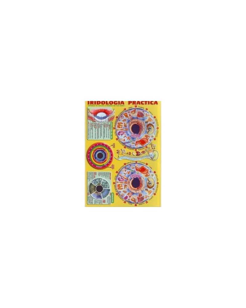 Conoce tu salud a través de los ojos. Estructura del ojo, densidad, mapa. Pigmentos, Signos más comunes. Las tres constituciones básicas y tratamientos curativos. Tamaño DIN-A4. Impresa a dos caras a todo color. Plastificado rígido, como los DNI.